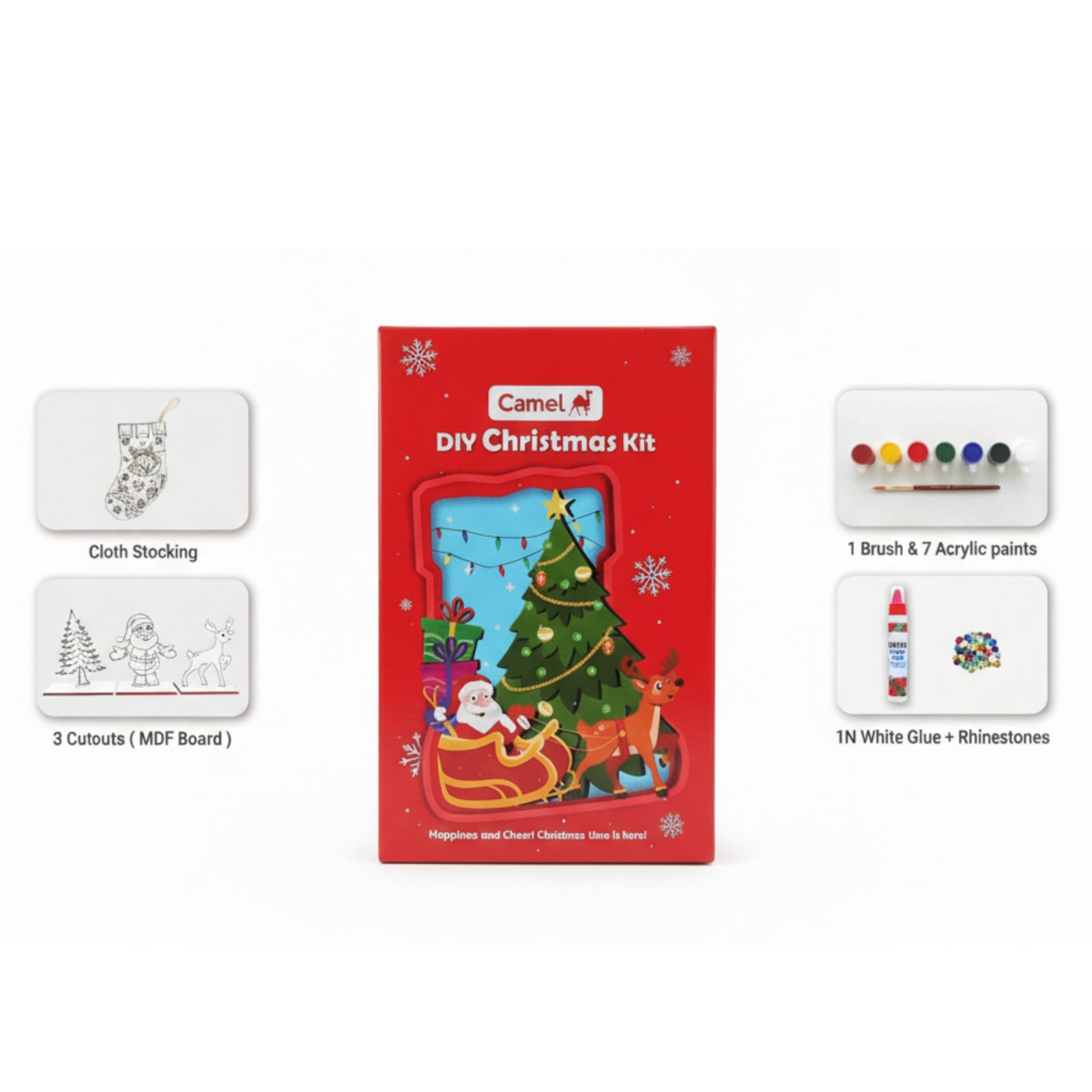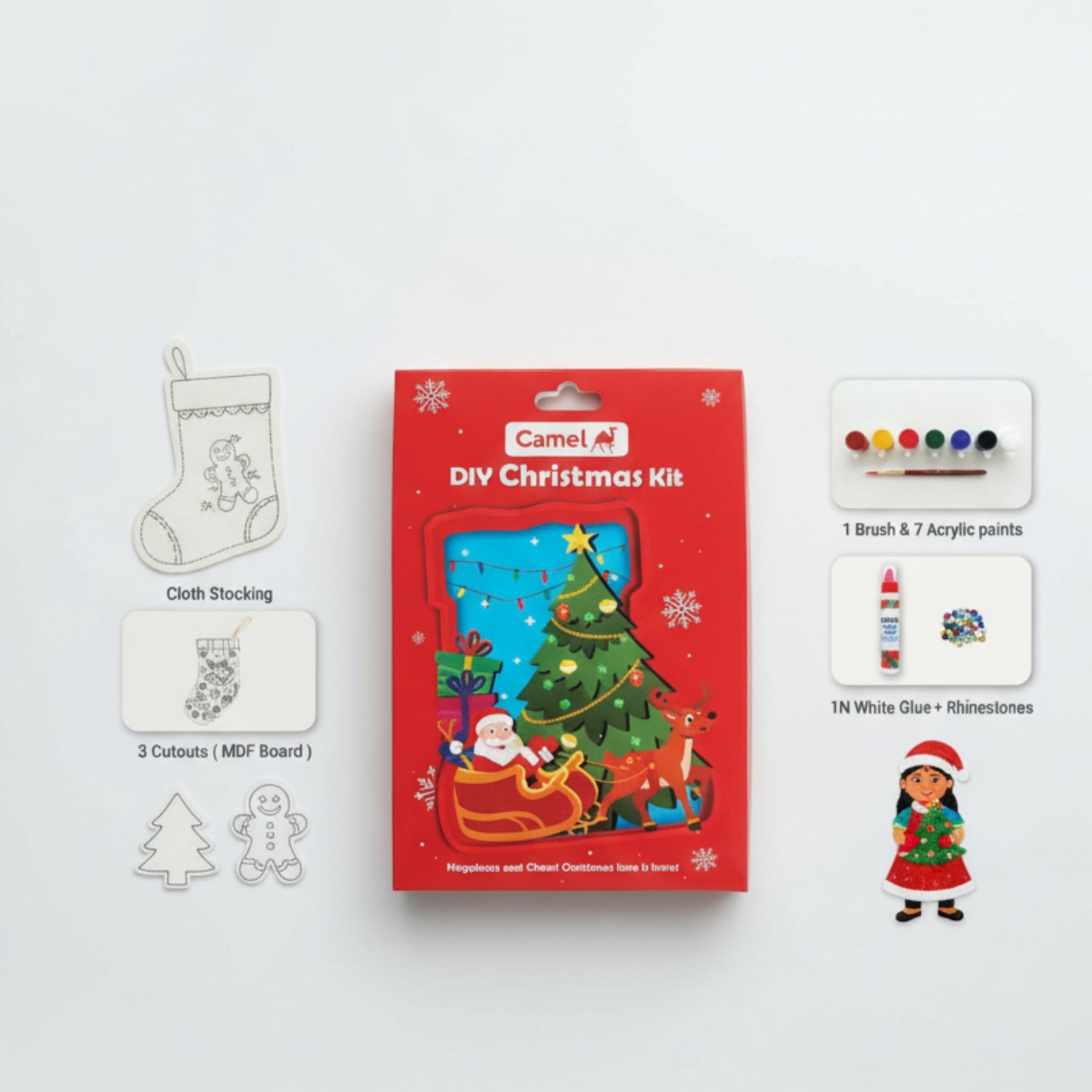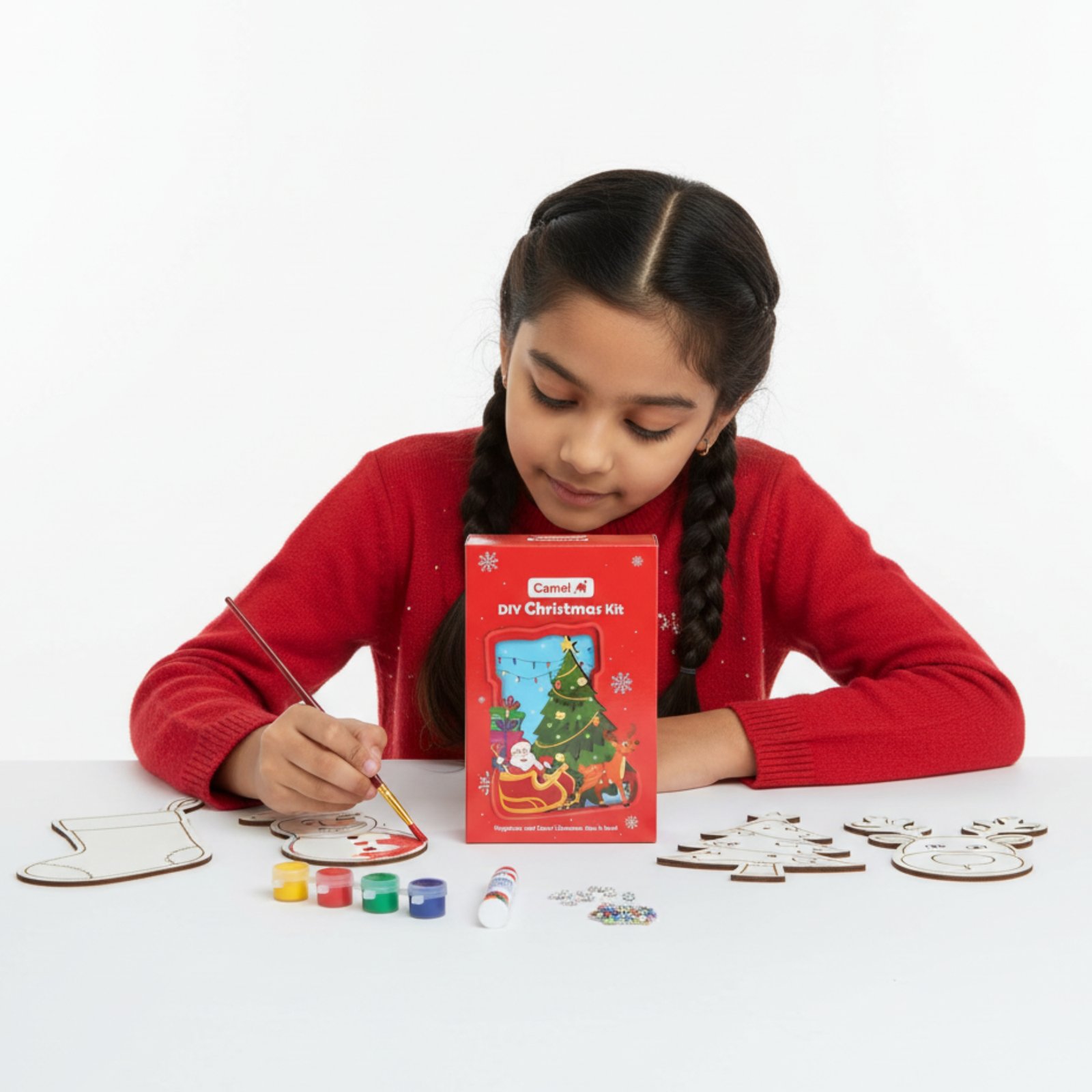The Camel Christmas Art Kit helps kids learn painting, decorating, color coordination, motor skills, creativity, and festive crafting. It is safe, engaging, and perfect for children aged 3+.